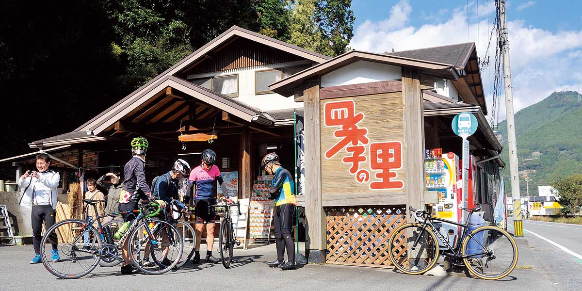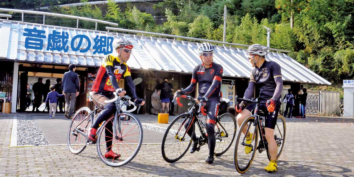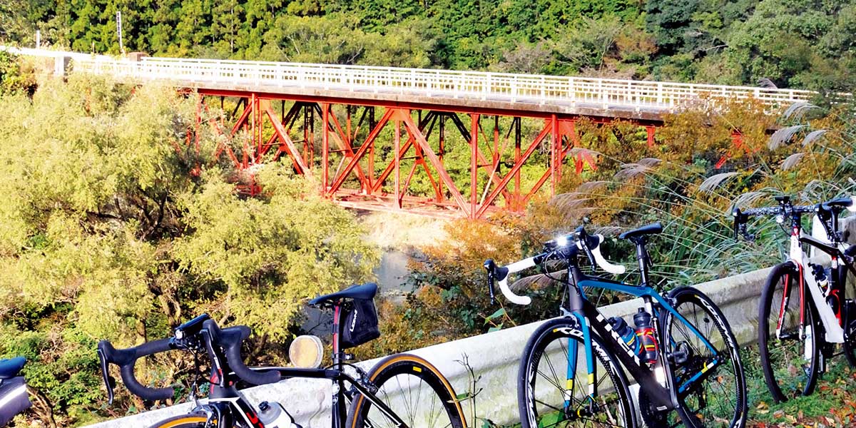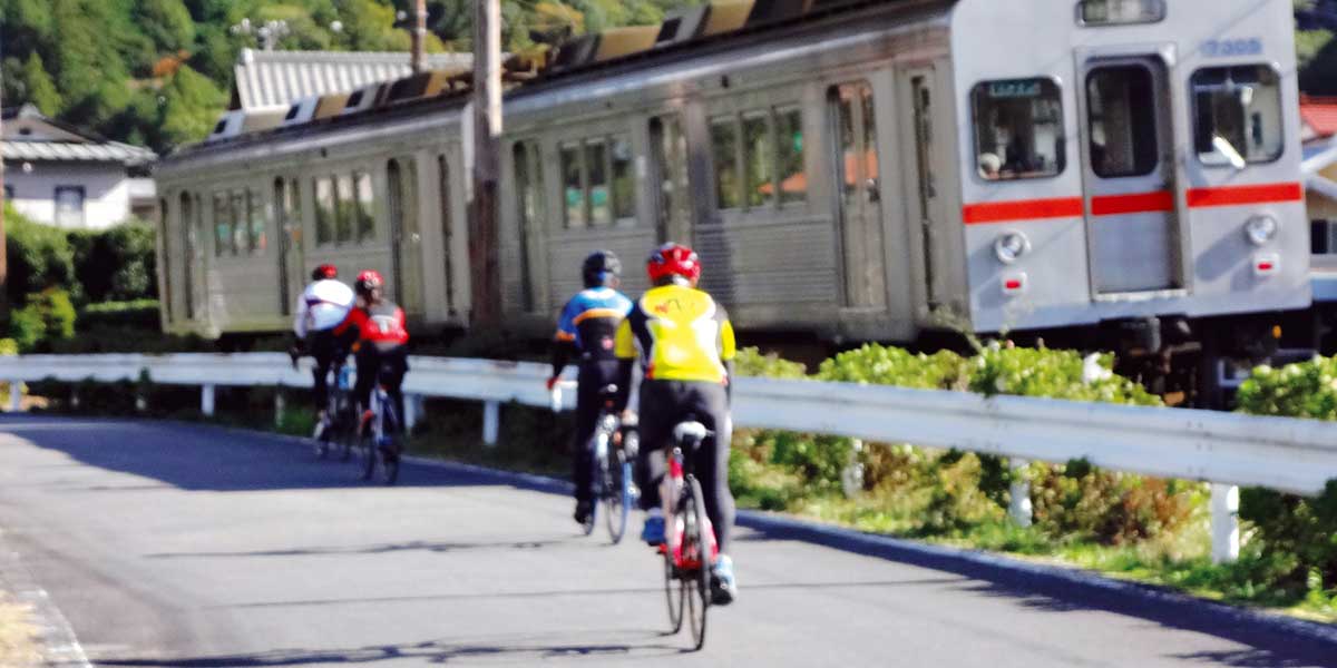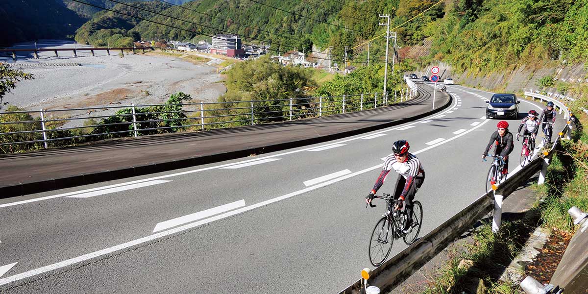 塩郷と地名駅周辺の坂道は、曲がりの多い下り坂です。スピードをしっかりコントロールしながら、車の走行に注意して走りましょう