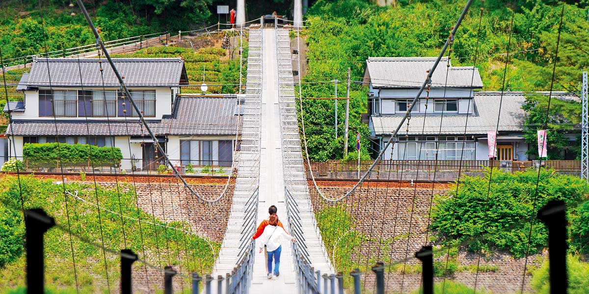 自転車を降りて、少し寄り道してみませんか。民家や線路の上を通るスリル満点なつり橋は長さ220m。大井川の大きな川幅が実感できます。